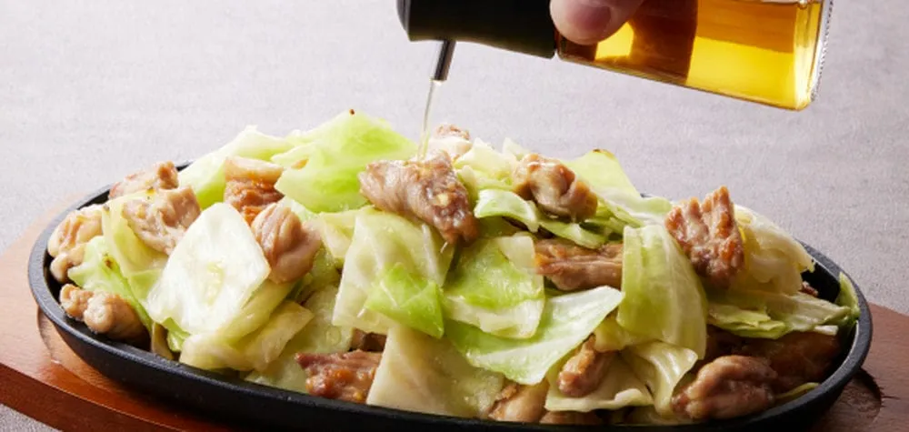 チキンマンの『鶏鉄板』は、博多名物焼肉鉄板を、国産鶏肉のせせりでアレンジした一品です。せせりと季節ごとに厳選した新鮮なキャベツとにんにくを香ばしく炒め、熱々の鉄板で提供しています。信州長野の味噌屋と半年以上の試作を重ね完成したこだわりの自家製辛味噌、オリジナルポン酢、さわやかな柚子胡椒、ガーリックチップ等お好みの味に変化させお楽しみいただけます。